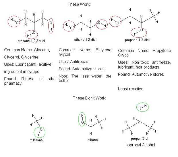 -Además, puede utilizar líquido anticongelante o parabrisas si contiene el glicol de etileno de ingrediente. Glicol de etileno es C2H4 (OH) 2, mientras que la glicerina es C3H5 (OH) 3. Es el grupo alcohol múltiples que hace le el trabajo. También, asegúrese de que es de la más alta concentración posible. Agua por lo general no ayuda con procesos de elaboración de fuego.