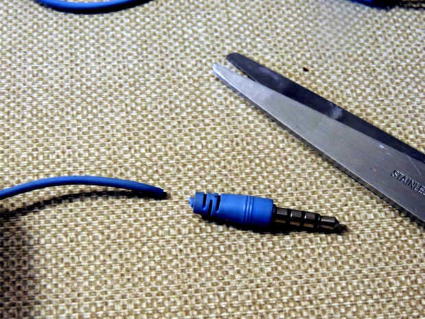 Tome el extremo del jack de los auriculares y corte el cable de donde se encuentran los dos. El final de mi gato era muy difícil pero a veces son más bien flexible. Si el final de tu gato es flexible, corte demasiado esa parte. La pelota de tenis es bastante cómoda y será difícil insertar el jack si su flexión todo.