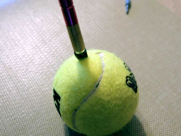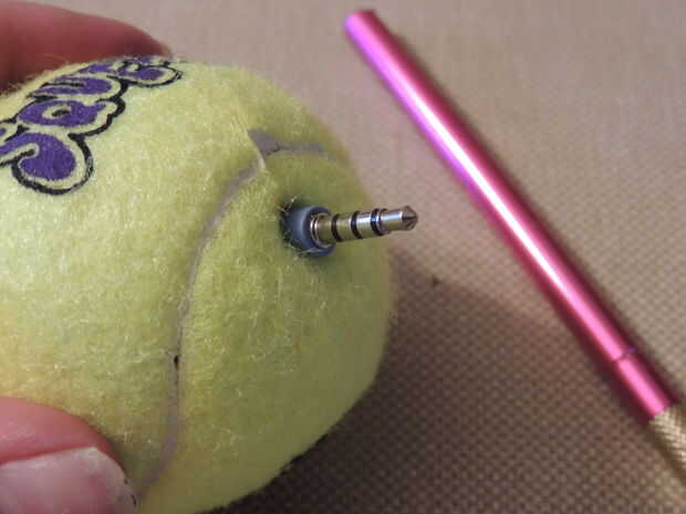 Para insertar al conector en la bola, usted necesita hacer algunos cortes. Presione con firmeza el cuchillo en la bola. Estas bolas de Kong son bastante fuertes por lo que tendrá que realizar algún esfuerzo al principio. Una vez que el primer corte, el resto será mucho más fácil. Gire la cuchilla 90 grados y hacer otro corte. Prueba de la bola y ver si puede apretar el gato en la abertura. Si no puedes, gire la cuchilla ligeramente y añadir más cortes como sea necesario hasta que el gato puede ser empujado. Terminé haciendo unos cuantos cortes terminan en un orificio de forma de copo de nieve. El agujero realmente no será visible como un taladro y no debería ser. Desea que las rebanadas para sujetar al conector en su lugar.