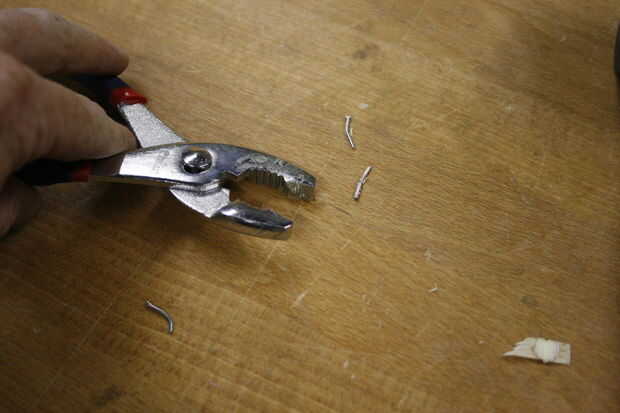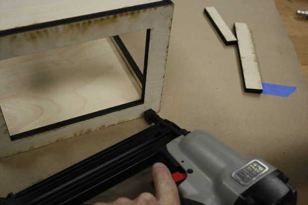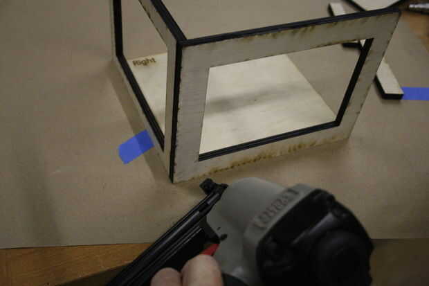 Usando una pistola de clavos del alfilerillo, sujetan la armadura de exoskelton.