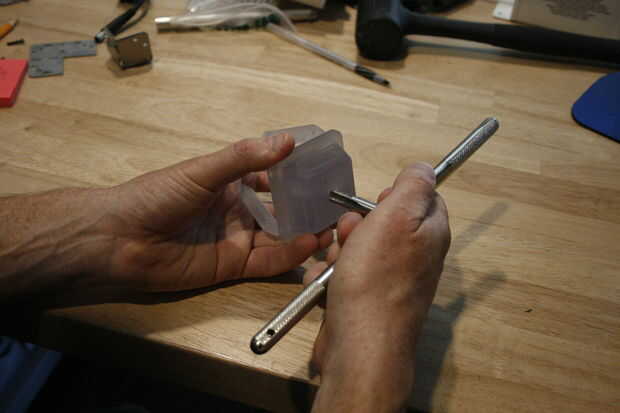Usando un kit de roscado, aprovechado la mano impreso en 3D para que coincida con la rosca de tornillo para un brazo de cuello de cisne de 2 pies.