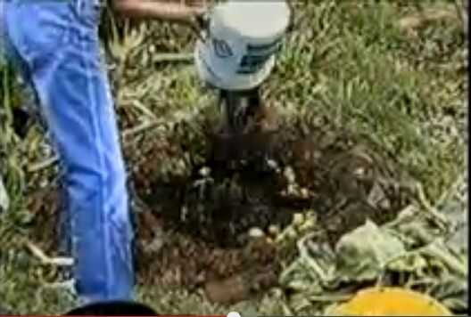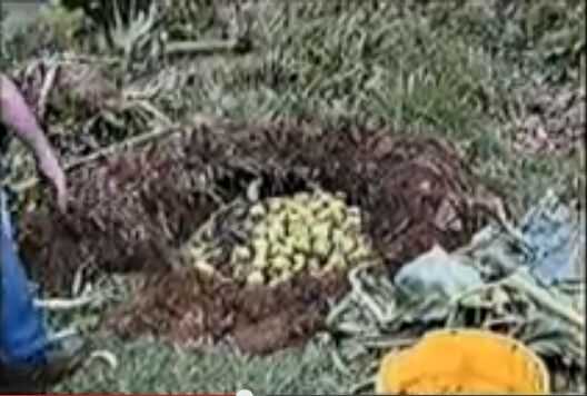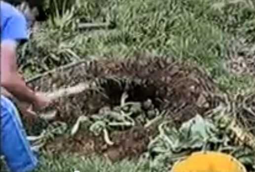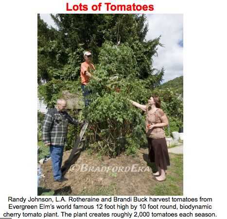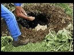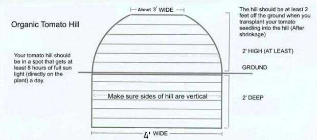 Cavar un agujero 2' redondo de profundidad por 4'. Construir colina de tomate por capas 6-12" orgánico basura (tabla desechos abonos animales, malas hierbas, recortes de césped o cualquier cosa que proviene de una planta o animal) con 2" - 3" de suelo - por cada pulgada de suelo por lo menos 2-3 pulgadas de compost. Capa de suelo y compost (residuos orgánicos) en capas alternas hasta que hill está a 3 pies sobre nivel del suelo. La colina se puede construir inmediatamente o durante un período de tiempo. Cuando transplante tomatera enterrar unos 2/3 a 3/4 de la planta en el centro de la colina. Siempre agua alrededor de las raíces de plantas con unchlorinated agua. NUNCA AGUA HOJAS DE UNA PLANTA DE TOMATE! Agua suficiente para que el Cerro siempre está húmedo - hasta cinco galones al día en tiempo seco. Continuar a lanzar trozos de tabla y en la colina de estiércol durante el verano y cubierta de basura con recortes de suelo, hojas o hierba. El basura/estiércol más, cuanto más grande la planta. Puede cortar mamones fuera de la planta y utilizar como mantillo. Si los animales se un problema, el Cerro de cerca de, o enterrar huesos carne profunda bastante eso animales no olerlos. Agregar carne o huesos al Cerro, después la planta está en el suelo. PAJOTE PESADAMENTE.