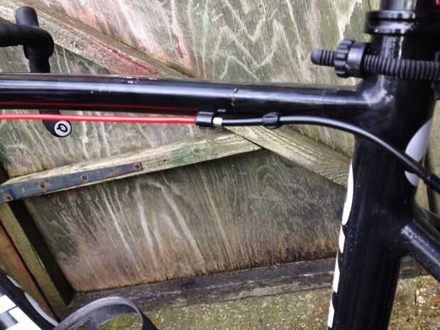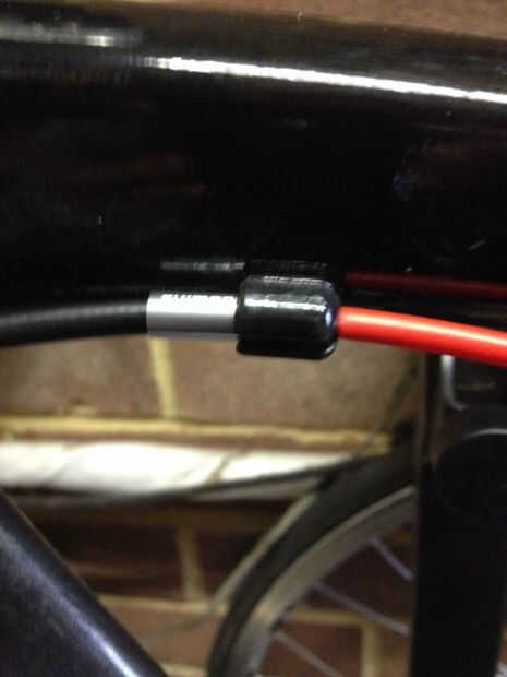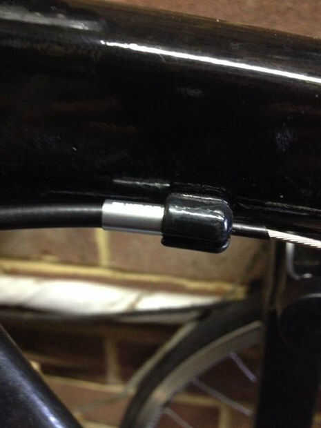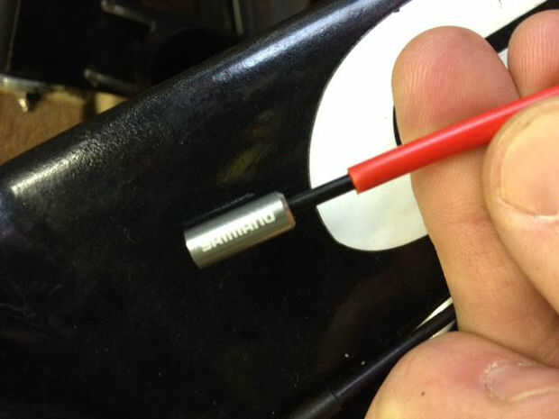 Cables de freno eran súper fáciles como la única pieza expuesta del cable interno en tubo superior (foto 4). Por lo tanto, ha aplicado la misma técnica. Ambos extremos nariz virolas de más un poco de tubo en el medio. Tuve bastante suerte y encontré un trozo de casi exactamente la misma dimensión interior manguera neumática como la nariz de las virolas. De todos modos, Nokon vendiendo el mismo tipo de línea de frenos (http://www.nokon.com/NokonUSA_Products%20%28black%29.htm) y con dos piezas de encogimiento de calor (igual que con los cables de equipo) hará el trabajo.