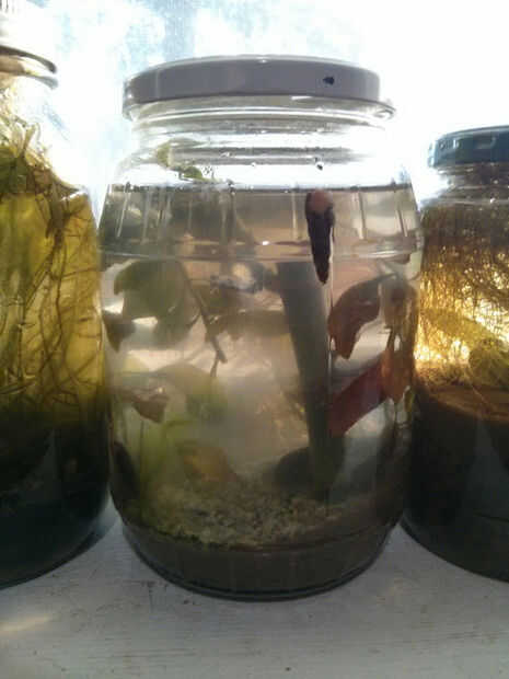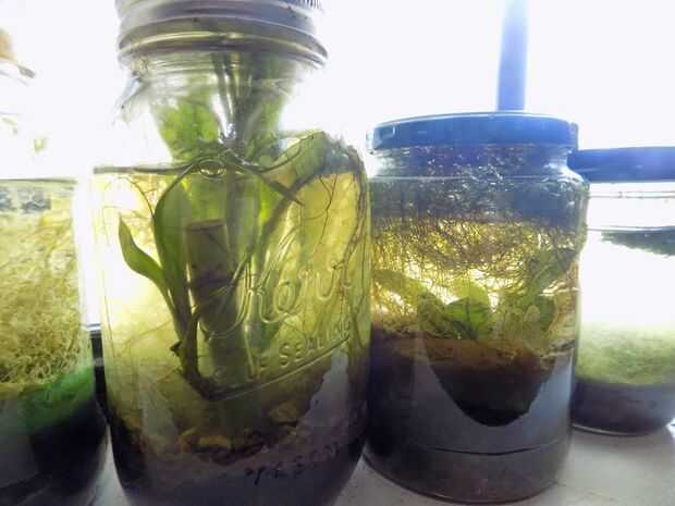 Decidí intentar mantener un poco de mi estanque en unos viejos frascos de salmuera. Uso de plantas acuáticas de la tienda de mascotas y el agua de mi estanque, hice unos seis diferentes tarros de diversos pedacitos de la vida. Yo les selló y puso en la repisa de la ventana; dos años más tarde, dos de ellos todavía va fuerte. La foto de arriba son los ecosistemas cerrados dos en cuestión - lleno de plantas y caracoles y bichos pequeños pequeños.