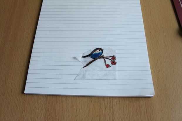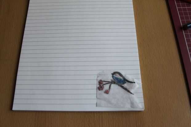 Este es un lindo pequeño pájaro listo regalar sus colores a mi papel de escribir. Coloque el ave frente a la derecha en el lado derecho del papel de escritura y dibujo/garabatos en la parte superior el lado equivocado del tejido hasta cubre toda la imagen. Cuidado... puede romper el papel... Hacerlo tan lentamente... También no se debe mover el tejido, así que manténgalo firmemente con los dedos. Una vez que ha dibujado completamente encima de la imagen poco a poco eliminar el tejido a... Allí se ve la imagen de pajaritos estampada en el papel para escribir... :)