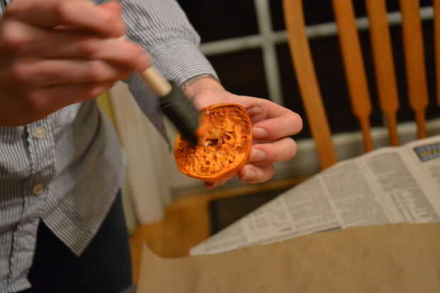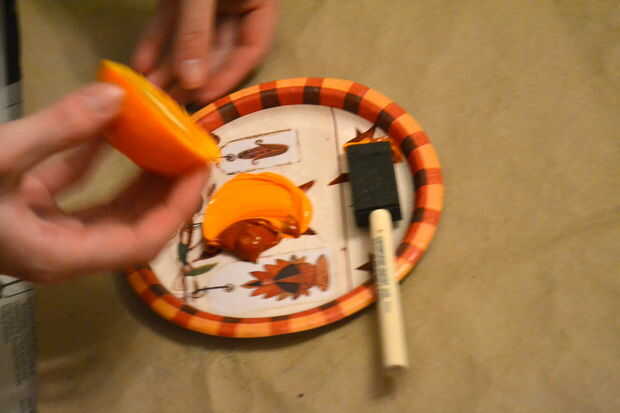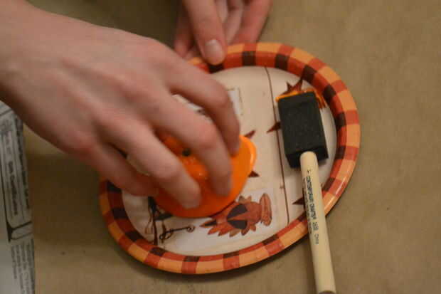 a continuación, apriete una cucharada tamaño decente de pintura sobre la paleta de la placa de papel y sumergir el sello de la fruta en el lado de corte de pintura hacia abajo.  Una vez que se ha aplicado la pintura, utilice el cepillo de espuma difundir hacia fuera y asegúrese de que todas las superficies están cubiertas uniformemente.