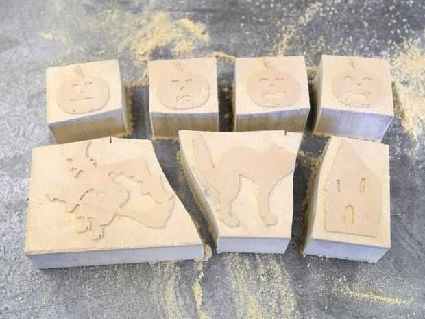 Se utilizó una sierra para cortar los bloques en trozos más pequeños, uno para cada sello. Esto hace el trabajo rápido de él, pero si desea hacerlo a mano, una sierra de marquetería funcionaría así.
