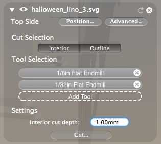 Estamos utilizando dos diferentes fresas para este proyecto: molino de un molino de punta plana de 1/32" para más detalles y una punta plana 1/8" para despejar las áreas más grandes. Si sólo usamos el molino de punta plana de 1/32", el trabajo tomaría un tiempo muy largo. Si sólo usamos el molino de punta plana de 1/8", se perderían los detalles. El uso de ambos tamaños de herramientas hace el trabajo rápido y detallado, lo que queremos. Elige tanto en la herramienta Selección.