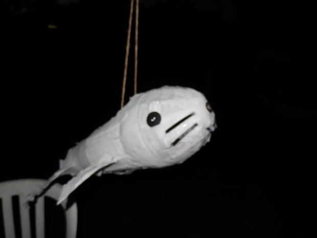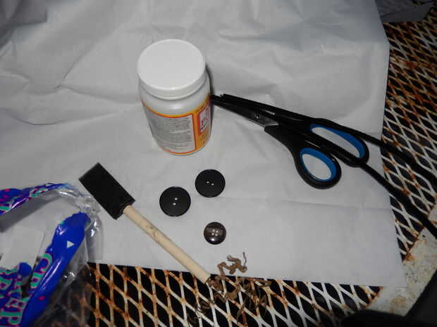 he decidido no le gustaba los ojos que compré para el sello, por lo que allanaron mi escondite de botón para encontrar algo me ha gustado mucho mejor.  Usé el limpiador de pipa para cortar bigotes y una boca.  El pegamento de aerosol no funcionaba bien en el limpiador de pipa o botones, así que fue hacia el cepillo mod podge y espuma.  Había pegado a la parte posterior de los botones y me mantuvo en su lugar mientras seca.  Los bigotes y la boca tienden a pegarse a los dedos, pero finalmente obtuvieron en el lugar también.  Encontrar un lugar para terminar el secado y listo.