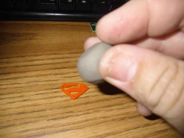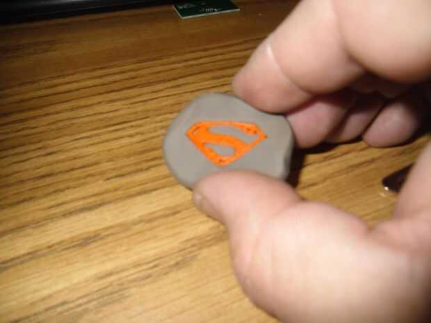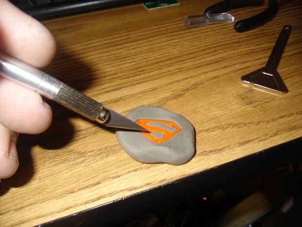 Invertir en primer lugar, el símbolo por lo que están viendo un S. "Hacia atrás" Tomar la arcilla y rodar en una bola. Aplastar la bola alrededor de la S, y cuando lo levanta de la mesa, deberías ver a un superman que aparece normal S. Retire con cuidado el 3D S impreso de la arcilla. Coloque la arcilla en el congelador durante unos 10 minutos para que sea firme.