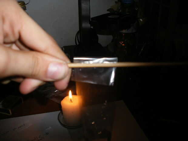 4. Utilice 1 mano para sostener el objeto en el plástico pasando al final pinzamiento sobre la llama. pasarlo rápidamente, pero no demasiado rápido. Retire del fuego si sella bien. Utiliza fotos para guiarte correctamente