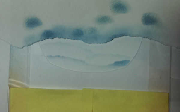 A continuación rasgar un pedazo de su papel de copia para formar algunas formas de colina y use una esponja de maquillaje o una brocha de afeitar para arrastrar la tinta del papel de copia a su tarjeta, a partir de la parte inferior. Mueva el papel unas cuantas veces para crear unas colinas, usar menos en como te vas para arriba el papel