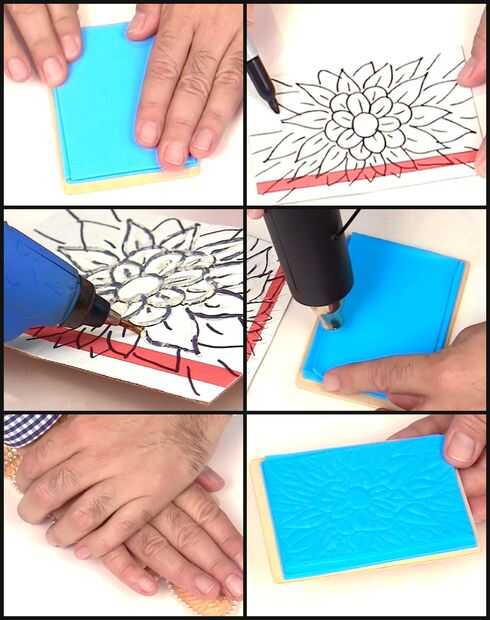 Presione firmemente el bloque de espuma caliente sobre el diseño levantado de pegamento caliente para hacer el sello de su