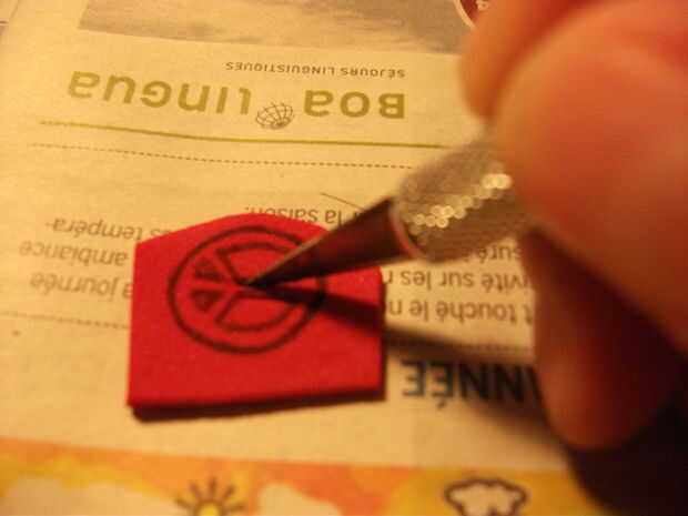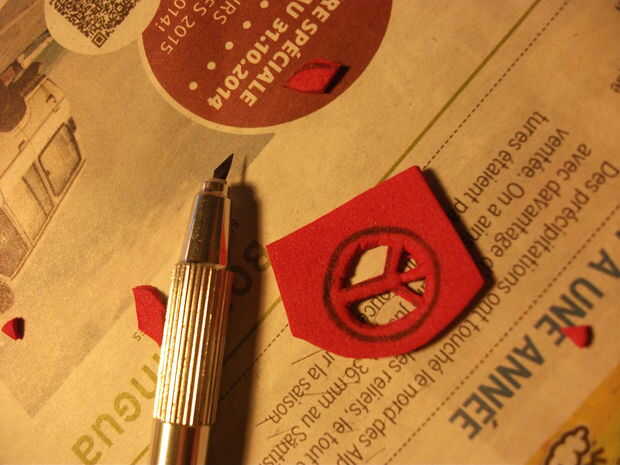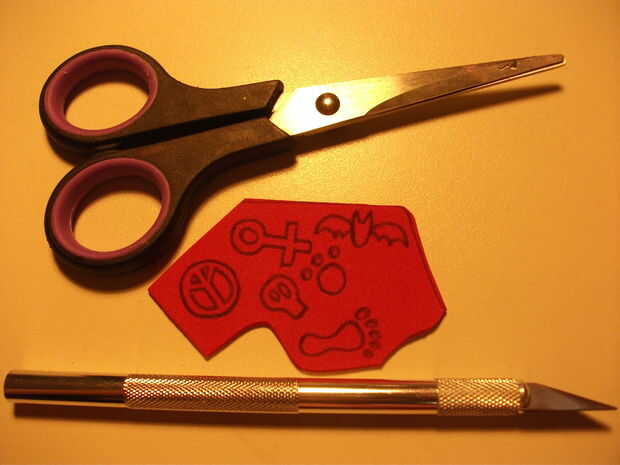 Ahora corte los dibujos. Si han diseñado símbolos con agujeros (como un símbolo de la paz), te recomiendo hacer primero los pedacitos más íntimos con un cúter y luego los bordes externos. Como dije, la elasticidad de la espuma de eva dificulta las cosas un poco en este paso.