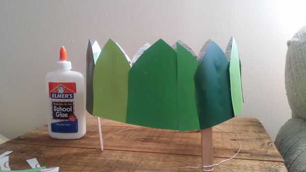 ya que estoy haciendo un tema de la selva que quería mi pantalla a ver como sale. I cortar formas de hojas en las muestras restantes y comenzó les pegando uno al otro y a la estructura de alambre (utilicé tiras de papel en la espalda para añadir estabilidad). He encontrado que haciendo una sola pieza en un momento fue más fácil que hacer toda la fila a la vez aunque va más lento. Hice tres filas para darle una buena mirada acodada y luego deje que se seque antes de manipularla mucho.