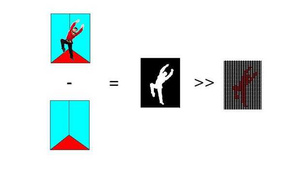 4) Extraiga a la persona ante la cámara. Utilizar coincidencia de pixel para extraer la imagen. Para guardar primero la imagen de fondo por separado y comparar esa imagen con la imagen actual, luego extraiga la imagen de diferencia. (Pantalla verde también utilizar según la disponibilidad).