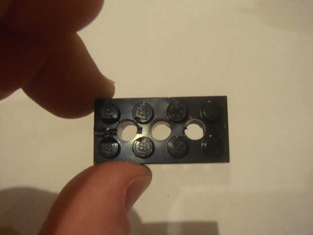 También necesitará hacer un orificio para el poste. Usé un taladro con sólo un poco del mismo tamaño que el diámetro exterior de la pieza de la manguera nervada, apenas tocando el borde del ladrillo, como se ve en la foto. Ya entonces también hackeado por una pequeña ranura en el plástico en la parte superior del ladrillo del LED, para asegurarse de que los dos ladrillos todavía cabido cómodamente junto con la manguera en su lugar.