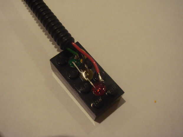 Ahora meter el LED correctamente en sus alojamientos (en el orden correcto - rojo, amarillo, verde!). Alinee los lados planos para que estén a lo largo de un lado del ladrillo. Doble las piernas sobre el lado plano para que mienten al ras con el ladrillo y toquen a lo largo de la longitud del ladrillo. La soldadura de las piernas y recortar cualquier exceso de alambre. Ahora doblar las otras piernas al ras con el ladrillo y ajuste de todos pero una muy corta longitud de cable, asegurándose de que no te toquen entre sí o cualquier otros cables.