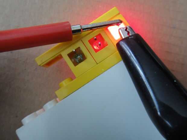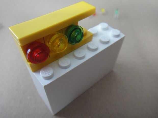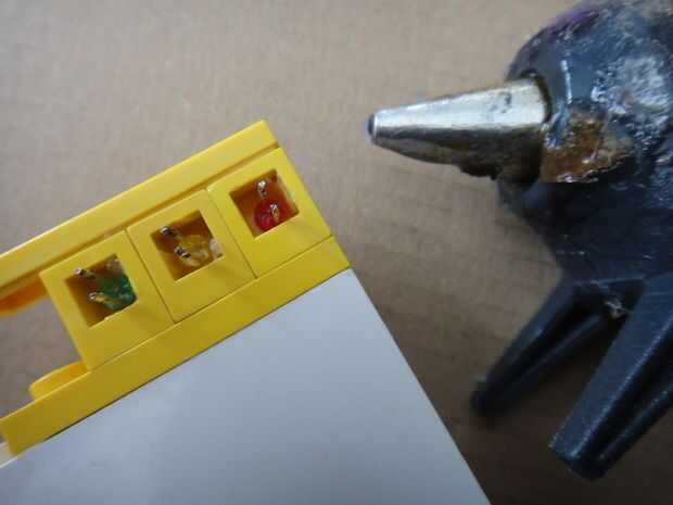 Con una pistola de pegamento caliente, aplique una pequeña cantidad de pegamento caliente en la parte posterior de la cabeza ladrillo ligero. Entonces rápidamente recoger el color correcto de los LED y meter en el cabeza ladrillo ligero hasta que pasa por el agujero y fondos hacia fuera el perno de 1 x 1 claro en el frente de la Asamblea de semáforo. Asegúrese de que el cátodo del LED se enfrenta hacia la parte inferior del ladrillo. Ánodos a la parte superior; cátodos en la parte inferior. Esto hará que la conexión de los LEDs más fácil.