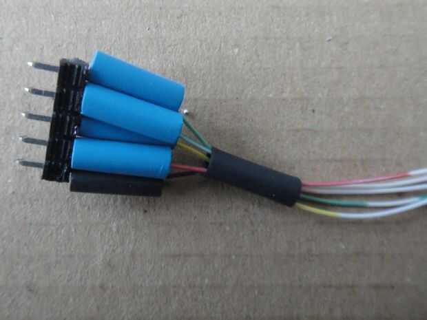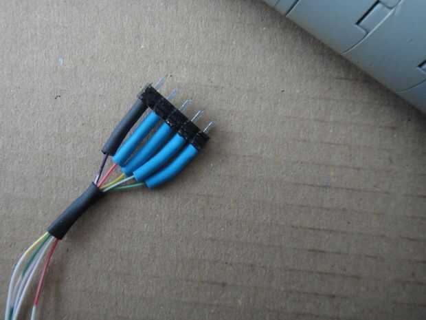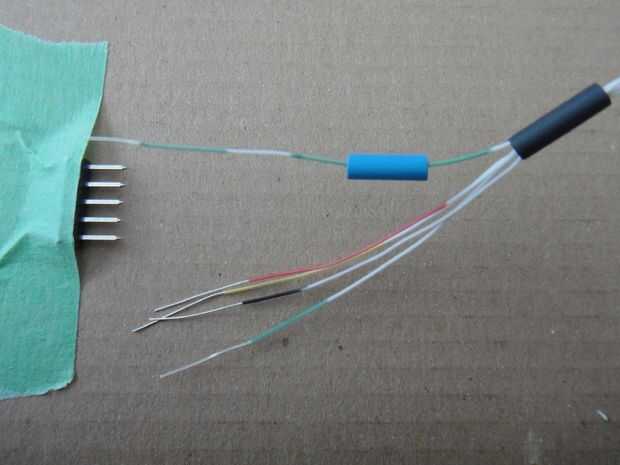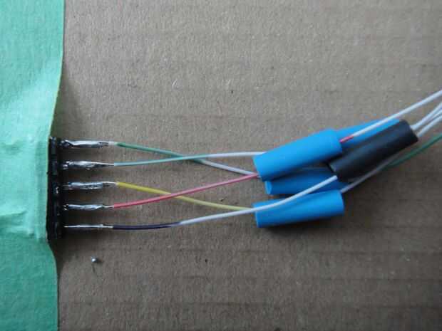 Deslice a un azul tubos termocontraíbles sobre el alambre para soldar. En la segunda foto, estoy para soldar el cable de avance verde. El orden de los pines de arriba a abajo