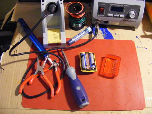 La electrónica en esta bufanda se basa en un intermitente de seguridad bicicleta de tienda de dólar. Es una unidad independiente para albergar las baterías, tiene un interruptor para cambiar los patrones de luz y contiene 5 LEDs rojos.