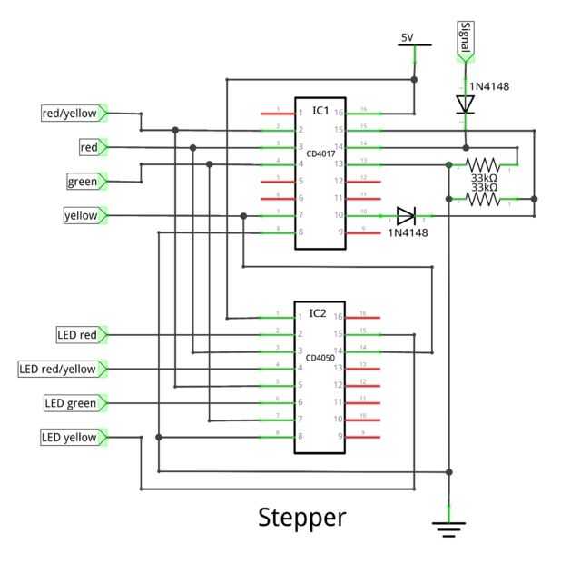 Como en los otros circuitos del CD4017 (contador de década) se utiliza para ejecutar a través de las fases. Pero usar sólo las salidas 0 a 3 para las cuatro fases. La quinta salida (4) pone el chip en 0. Para mi setup CD4050 (almacenadores intermediarios no invertir Hex) no es realmente necesario pero con es posible utilizar más de uno conducido por color.