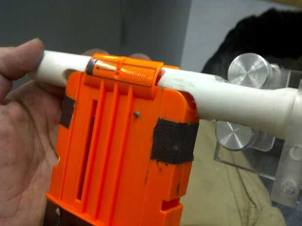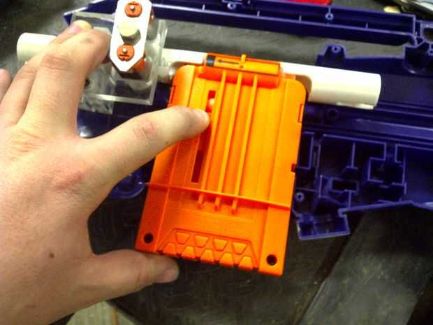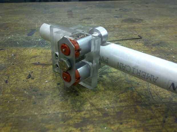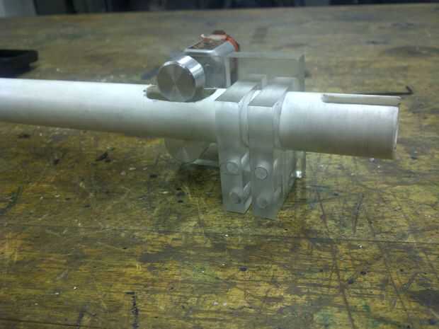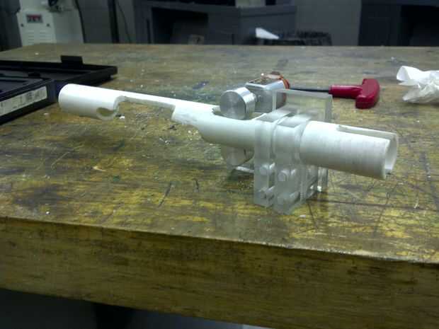 - Comience por cortar todos tus espacios en blanco, compruebe los dibujos proporcionados. Asegúrese de hacer todo tan exacto como sea posible, esto reducirá drásticamente sus dolores de cabeza más adelante. Vea las imágenes debajo de reunión y de referencia. La recámara de PVC cortada a mano usando una Dremel (disco abrasivo de corte y esmeril) y ajustar para adaptarse a la revista y volantes. Los bolsillos en la placa portadora fueron diseñados para estos motores (Tamiya par había ajustado motor) pero cualquier pequeño motor rc hará. Sugeriría que usted perfore y aprovechar todos los agujeros en los soportes de barril (con la exclusión del orificio para el cañón). A continuación, perfore y ensanchar los orificios de la placa portadora principal. Una vez que todo está perforado y alineado, tornillo la Asamblea Junta y corte/taladro principal alesaje para que el cañón en.