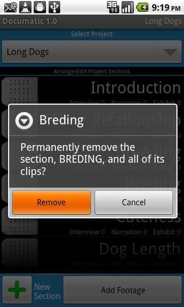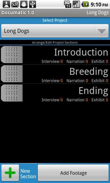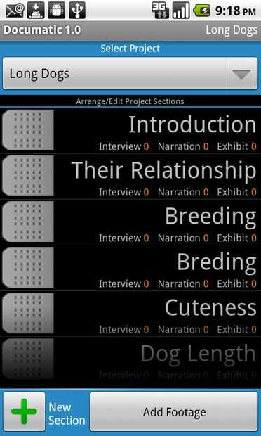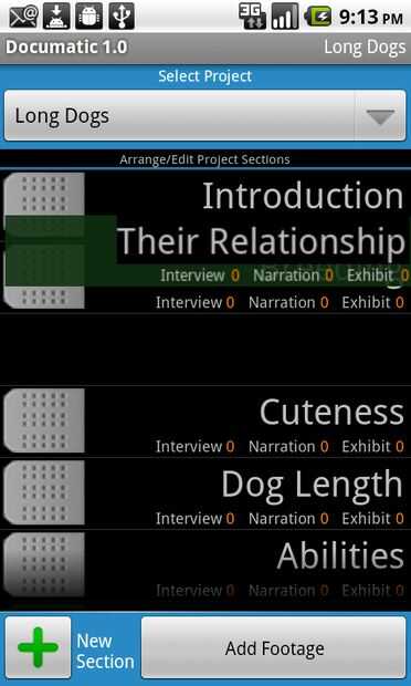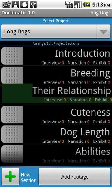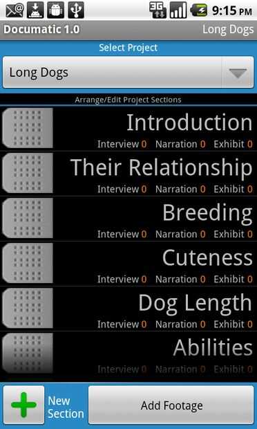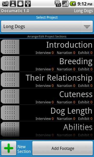 En mi ejemplo de documental "Perros largo", algunas de estas secciones fueron, "cría," "Habilidades" y "Ternura"