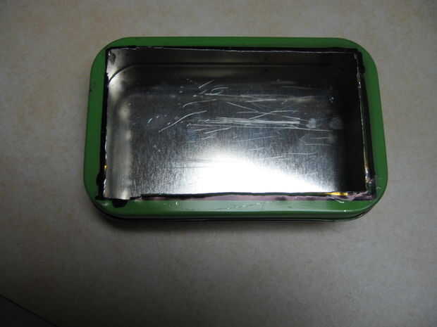 Utilizando un rotulador, dibuja un rectángulo más o menos conformes a la frontera de swirly logo en el exterior de la lata. Luego cortar (en realidad utilicé pinzas para cortar a pedacitos diminutos a la vez) el rectángulo hacia fuera y el archivo abajo de los bordes.
