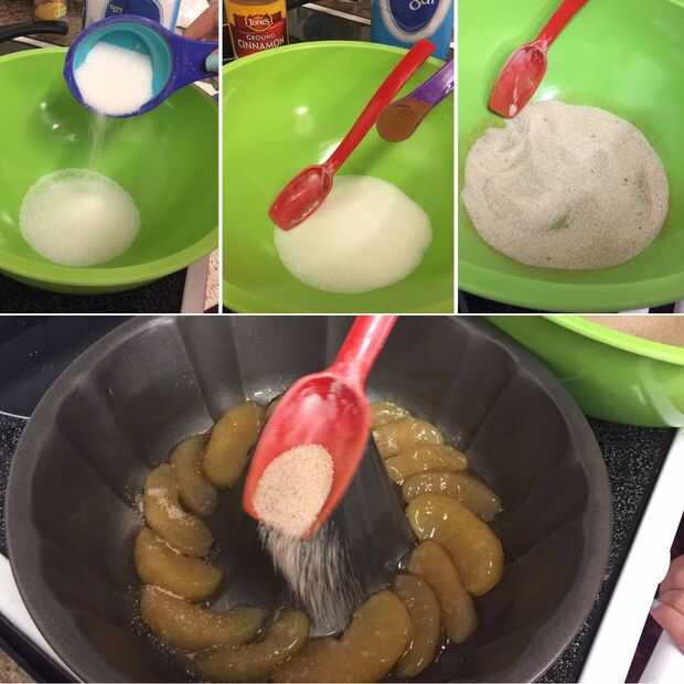 7. una vez el azúcar Canelo combinan espolvorear 1/3 de su contenido sobre las manzanas en el molde para pasteles.