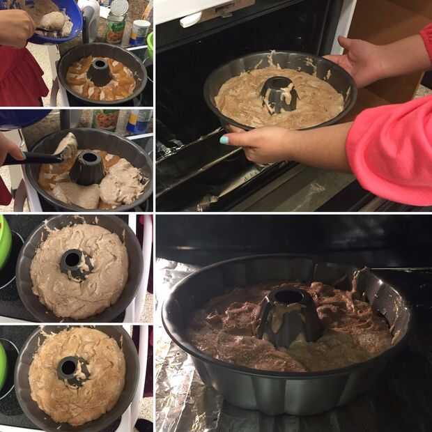 1. con una cuchara grande, cuchara uniformemente la mitad restante de la masa de la torta a la bandeja de la torta llena ya a mitad de camino.