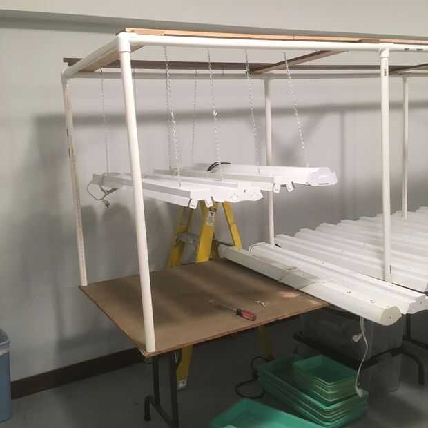 Si usted tiene un problema de espacio para siembra semilla interior, que puede instalar una mesa de interior crece en usted carpintero 's Banco.Materiales:Panel de madera contrachapada o maderaCadenasFluorescentes y luminarias crecerán lucesTornillos