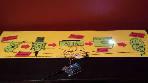 Este proyecto combina etiquetas engomadas del circuito Chibitronics con Arduino sencilla programación para crear un cartel con luces parpadeantes que ilustra el flujo de la señal de grabación básico studio!