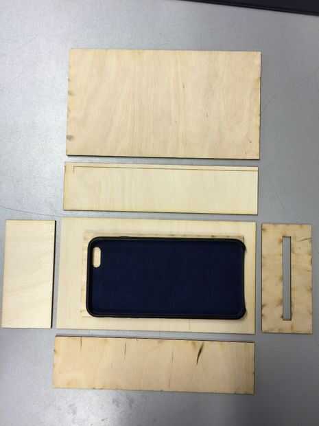De verschillende piezas zijn uitgesneden doormiddel van een lasersnijder. DEze worden piezas más adelante en la dirección geschoven, en gelijmd voor stevigheid. De mobiele wordt en een bandeja geschoven die omringd es puerta allumium folie. DIT zorgt ervoor dat WIFI en telefoonsignalen worden geblokkeerd.