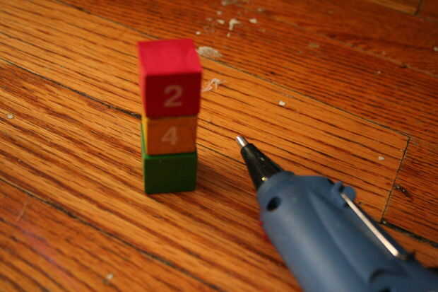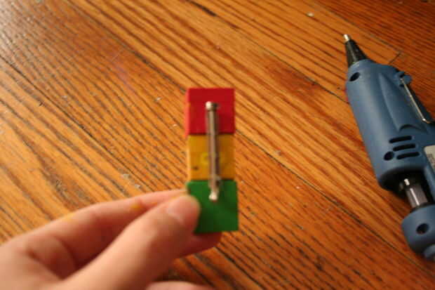 Ahora, una vez que la pintura haya secado, utilice pegamento caliente para armar los cubos juntos para que se vea como un semáforo. Recuerda, el rojo va en la parte superior, el amarillo va en el medio, y verde va en la parte inferior. Luego, coloque un alfiler en la parte posterior.