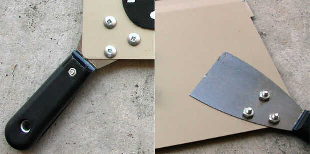 Con una broca de metal de perforación correspondientes aberturas en mango de cuchillo de compuesto de juntas y una esquina de la chapa. Fijar mecánicamente el cuchillo de compuesto de juntas para el metal de hoja con frutos secos al menos 3.