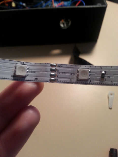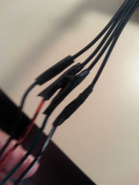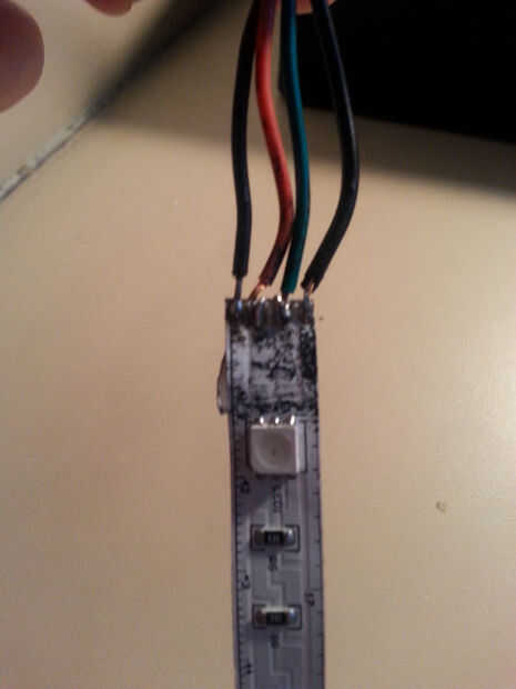 Un amigo mío fue suficiente para que me deje tomar prestado su soldador. Junto con él, tenía 4 carretes de hilos, que en la tira. Yo despojado de los cables de 4 pines JST SM juego de cables con tijeras y torcido de los cables con su respectivo cable RGB a continuación, grabado sobre ellos individualmente, como se muestra arriba. Yo entonces grabado hacia abajo el alambre hasta que la parte que sobresale de la lámpara (ver en el siguiente paso) es un color sólido y cables no sobresalen por todas partes.