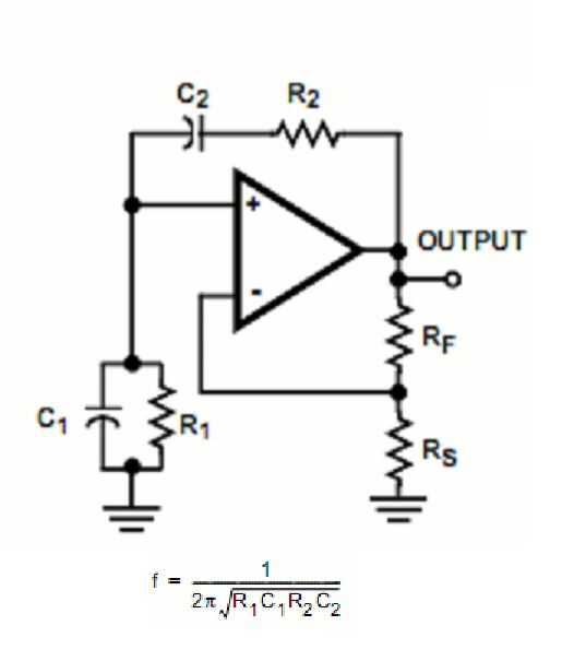 En la figura anterior muestra el diagrama del circuito para un oscilador de puente de Wien y da la fórmula para calcular su frecuencia en Hertz [Hz].