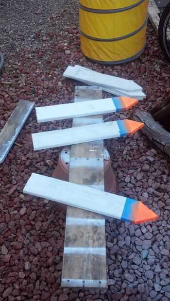 Se utilizó pintura blanca para nuestro color primario y una vez seco pintores usado cinta para crear un borde entonces utiliza naranja fluorescente para el final de la flecha. Esto le permite mucho espacio para crear tu propio mensaje o nombre de campo para familia y amigos para seguir las indicaciones fácilmente sensibles! Nos anexamos a varillas de metal usando un corchete del metal con una tapa para que la varilla puede ser martillada hacia abajo y luego el signo colocado sobre la barra y apretado para el retiro y fácil configuración.
