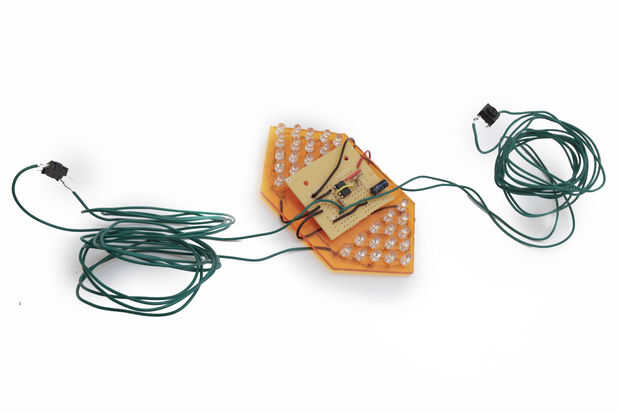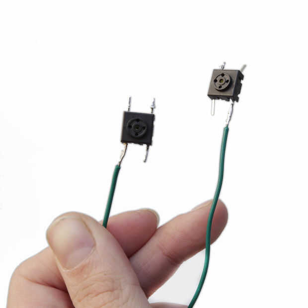 Cable de los conmutadores táctiles para que los cables estén soldada caddy-esquina a unos de otros, entonces ejecutar que dos hilos de 5 pies más hacia lo positivo conduce en las matrices de LED.