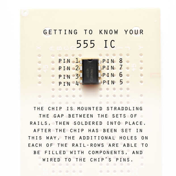 Desea montar el temporizador 555 IC por lo que extiende el centro de la placa proto. Soldar en su lugar.