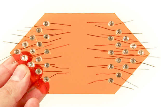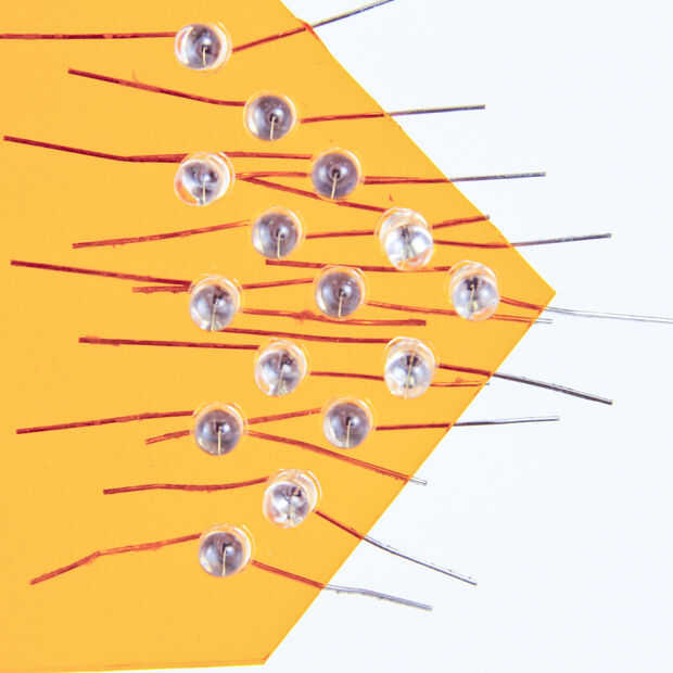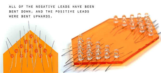 Del hilo de rosca todos sus LEDs en sus orificios en la placa de acrílico para que todos los cátodos están de un lado, y todos los ánodos están en el otro. Todos los cátodos una forma había doblada, y los ánodos, por lo que pude seguir en cuanto a que fue positiva y negativa cuando estaba soldando todo esto juntos.