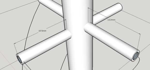 Buscar el posicionamiento y marcar: el soporte es una pieza única que pasa por el 2" PVC en el centro. Necesitamos el espacio adecuado para que los soportes son de la longitud adecuada a cada lado. Matemáticas nos pueden ayudar. Simplemente tomar la longitud (292mm ó 276.1 mm), dividir por dos para encontrar el punto medio, añadir en el radio de la PVC de 2" a cada lado para obtener la posición donde el borde de la PVC de 2" con el apoyo, estas se observan en la parte superior del diagrama de SketchUp y la imagen de la captura de pantalla de esta página:
