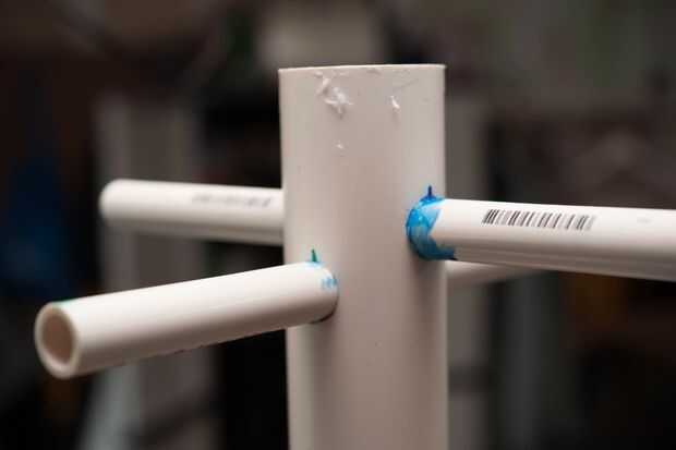 Pegamento: el PVC pegamento obras derretir ligeramente el PVC y permitiendo que las dos piezas para fundirse como el secado del pegamento, pegamento estupendo funciona del mismo modo. Eso significa que no tienes mucho tiempo para obtener la posición correcta antes de que la cola empieza a. El pegamento tiene un olor de gran alcance que no es bueno para usted lo uso en un área con ventilación adecuada. Soporte de posición una 1/2" por lo que se alinea en el centro de PVC de 2". Ahora compensado en una dirección aproximadamente una pulgada y aplique una capa de cemento de PVC alrededor de la 1/2" ayuda. Volver a la posición correcta, el sharpie colores pueden ser un poco difíciles de ver con el cemento azul en la parte superior centro de comprobar mediante el uso de una regla para medir el 115,4 mm o 107,6 mm del borde del PVC de 2" a cada lado.