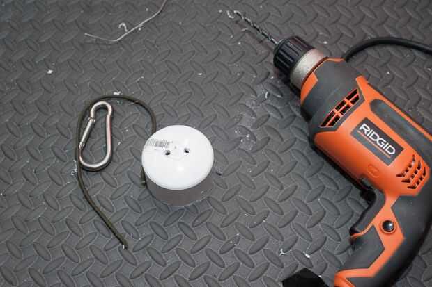 Utilizando la tapa del extremo estamos haciendo una forma rápida para colgar la antena. Simplemente taladrar dos orificios de compensación en la tapa de PVC y utiliza un pedazo de paracord para hacer un colgante de lazo (ver imagen). No pegar esto hasta después de que tenemos los cables en el siguiente paso!