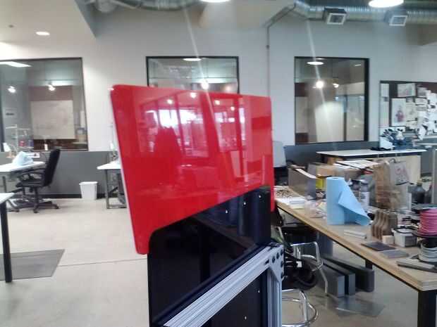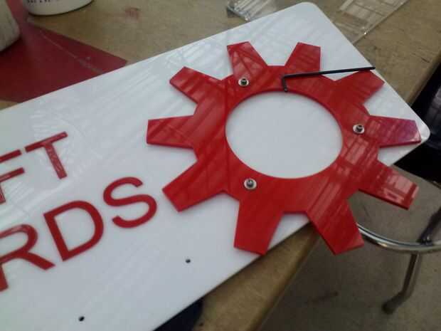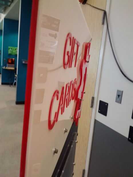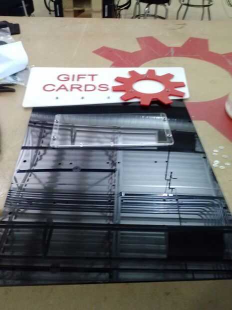 Después de instalar los insertos, el. 125" rojo acrílico panel posterior y el equipo rojo se pueden conectar al panel"Tarjetas regalo"blanco. El panel acrílico nuevo rojo tendrá que ser pegado al panel blanco alrededor de los bordes con pegamento de acrílico para mantener los dos paneles ajustada entre sí. Va lentamente alrededor de la frontera con el pegamento, un pincel pequeño y usando los dedos para sujetar las piezas juntas mientras el pegamento adhiere el acrílico parecían funcionar mejor.