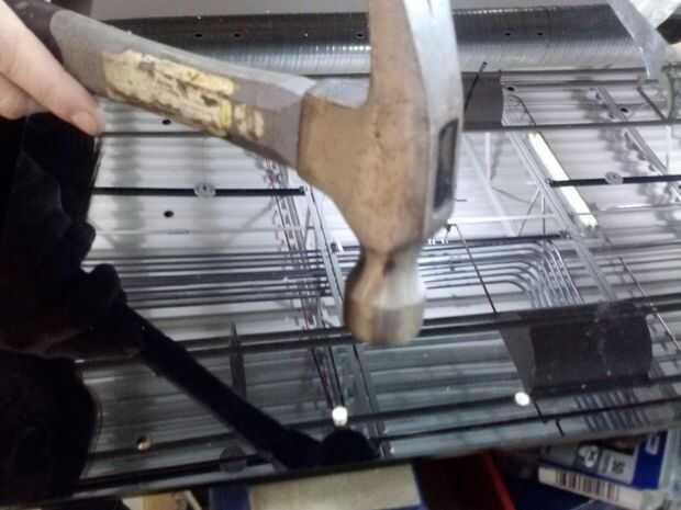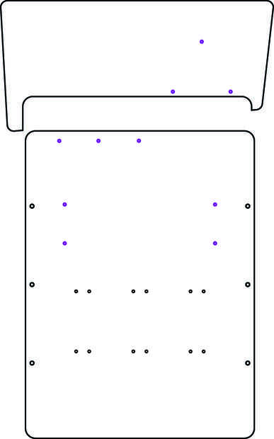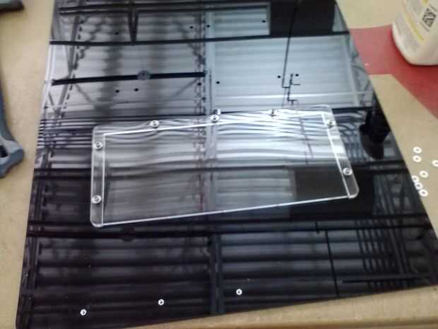 Después de que se han cortado todas las piezas de acrílico, se pueden instalar los insertos roscados plásticos. Desde la parte posterior de los paneles con el fin de forma hexagonal de la parte movible hacia arriba, el inserto puede ser martillado suavemente en el plástico. Martillar sobre una superficie del metal parece que funcionan mejor. Los diez orificios en que los insertos deben instalarse aparecen en color púrpura en la imagen adjunta.