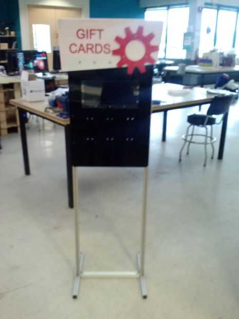 Después de que el panel se une a la estructura de que las tapas de 80/20 pueden ser insertadas en los extremos expuestos del canal 80/20, el tablero de clavija de ganchos pueden ser insertados en la señal y el 11 "x 5" claro bolsillo acrílico puede ser llenado con información impresa de la promoción de tarjeta de regalo.