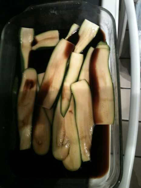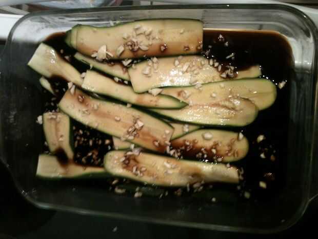Ahora es el momento de la marinada el calabacín. Tomar el molde para hornear y disponer las tiras de calabacín dentro. A continuación, tomar la salsa de soja y viértalo en la sartén. No es mucho para cubrir los calabacines. A continuación, tomar el ajo y espolvorear sobre el calabacín. Déjelo reposar un par de y de minutos darle la vuelta y dejarlo a sentarse.