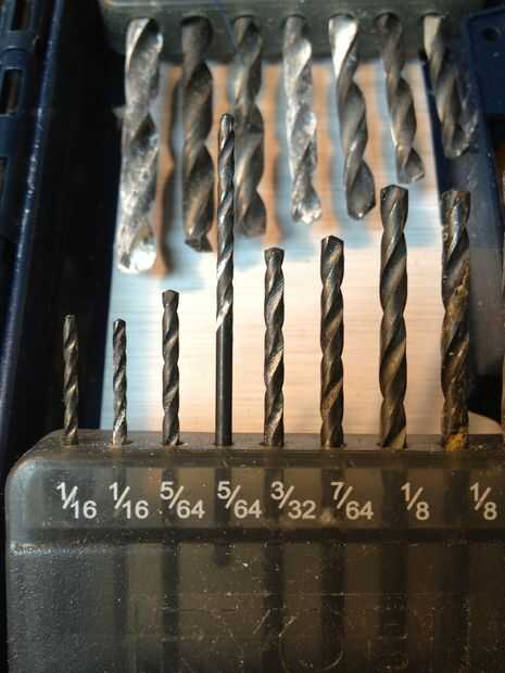 Usted querrá escoger un tamaño de pedacito de taladro más pequeño que el ancho de la hoja para que quepa bien en el mango sin ningún movimiento. Elegí un 5/64" para esta hoja de Sierra de marquetería.